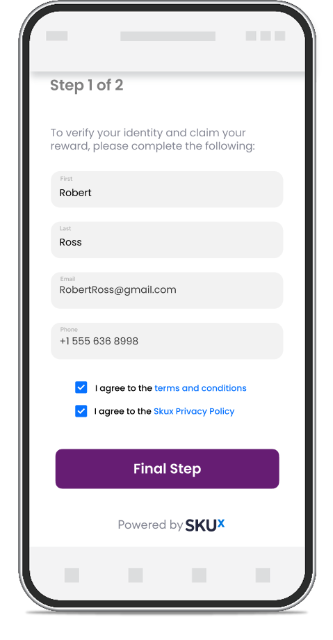 Consumer enters information, is verified in compliance with regulatory standards, agrees to Privacy Policy and T&Cs before offer activation