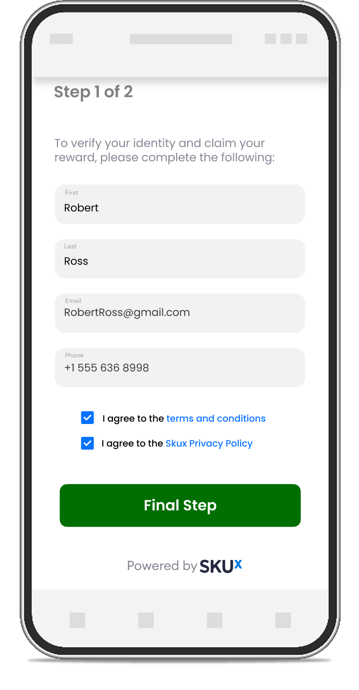 Consumer enters information, is verified in compliance with regulatory standards, agrees to Privacy Policy and T&Cs before offer activation
